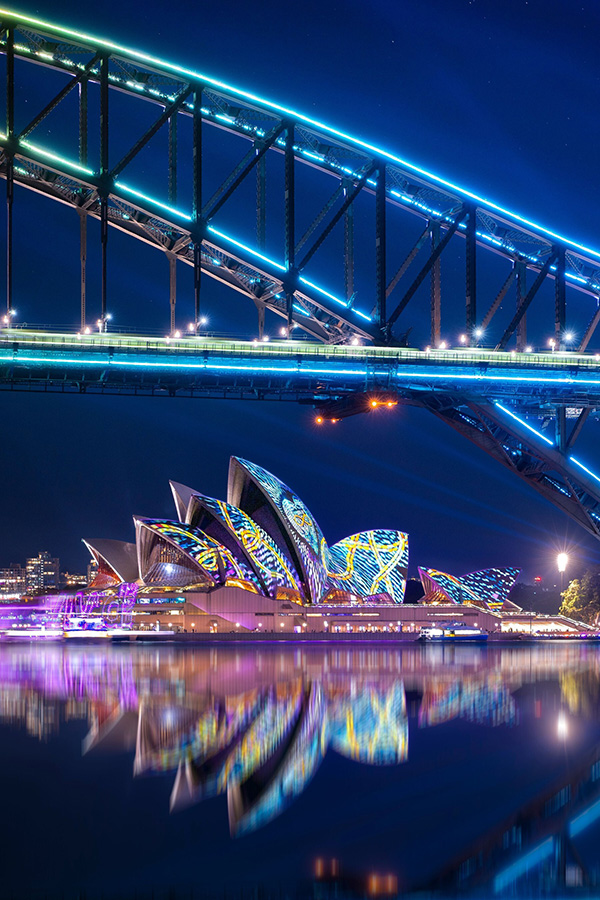 - Opera Mundi, an original commission by French artist Yann Nguema, illuminates the sails of the Sydney Opera House.